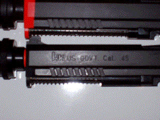 Performance: Straight out of the box, the KJ Socom is a little stiff in the trigger, but after firing a few magazines, it does loosen up a lot. Accuracy is great when using single action (the hammer is cocked back and ready for the next shot), but lacks a bit with the stiff double action trigger, but that's the same with any non-blowback gun. From 30 ft, I was able to double action a two inch group with ten shots, but was able to do a one inch group when using single action. There wasn't much difference in accuracy with the silencer, but the difference in velocity was huge adding Over 100 f.p.s. to the gun. With .2 gram bb's and green gas, the first 3 shots came out at 340 f.p.s. without the silencer. With the silencer, it jumps instantly to 450. A really cool thing about this gun is that it'll take the infamous RED GAS! Without the silencer it shot at 360 - 380. With the barrel extension it shot 470 - 480. |